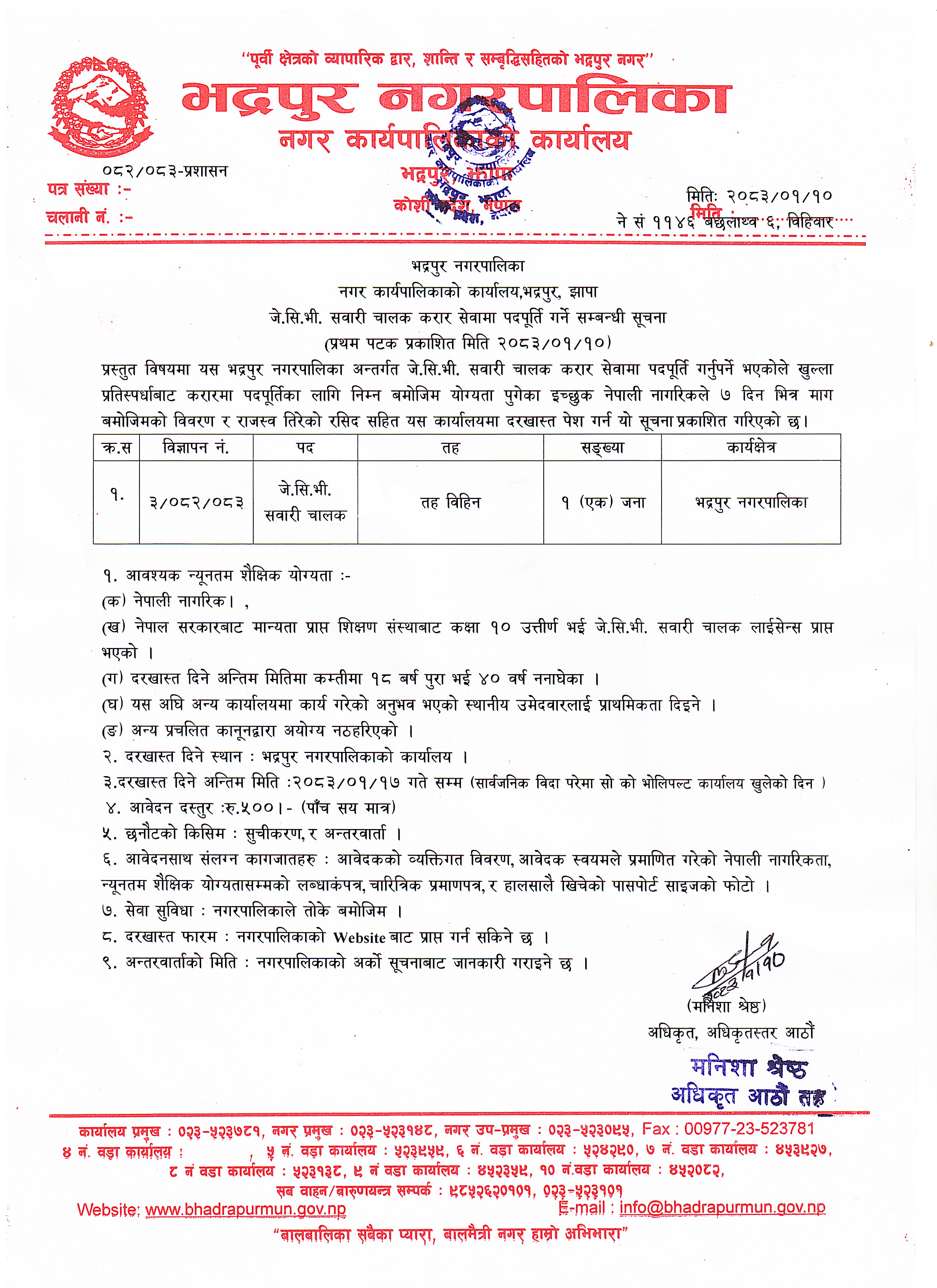 JCB सवारी चालक करार सेवामा पदपूर्ति गर्ने सम्बन्धि सुचना